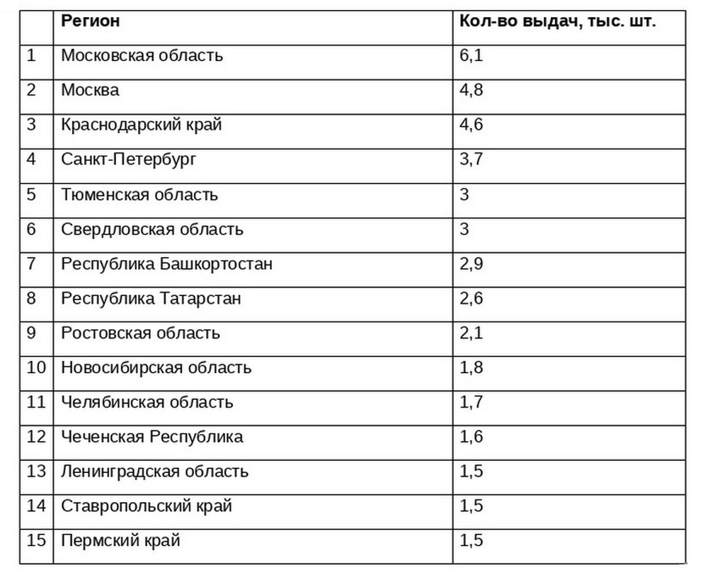 «Больше всего ипотечных кредитов и по базовым, и по льготным программам было выдано Московской области (6,1 тыс.) и Москве (4,8 тыс.). Также в пятёрку лидеров по количеству выдач в предновогодние две недели и в праздники вошли Краснодарский край (4,6 тыс.), Санкт-Петербург (3,7 тыс.) и Тюменская область (3 тыс.)».