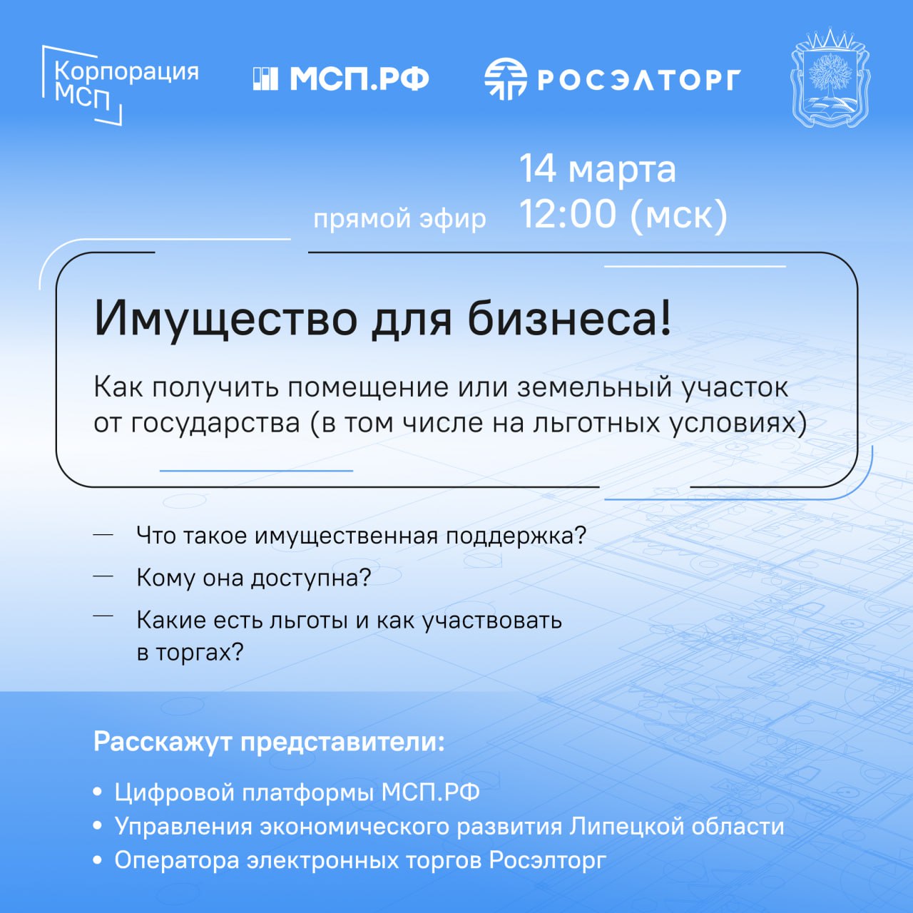 Эфир состоится 14 марта (среда) в 12:00 . Экспертами выступят представители Цифровой платформы МСП.РФ , Управления экономического развития Липецкой области и оператора электронных торгов Росэлторг.
