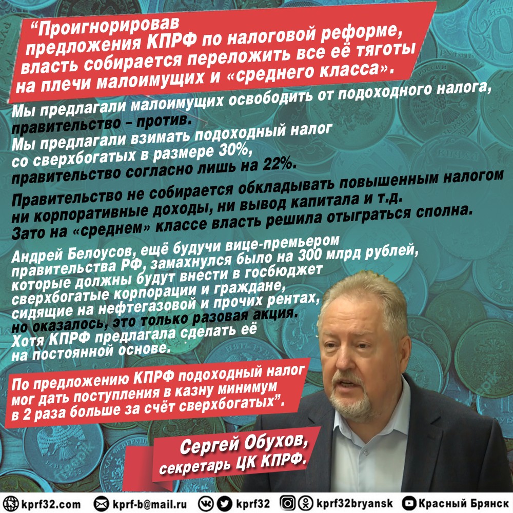 Вывод С.П. Обухова: проигнорировав разумные предложения КПРФ и Зюганова по налоговой реформе, власть собирается переложить все её тяготы на плечи малоимущих и среднего класса.