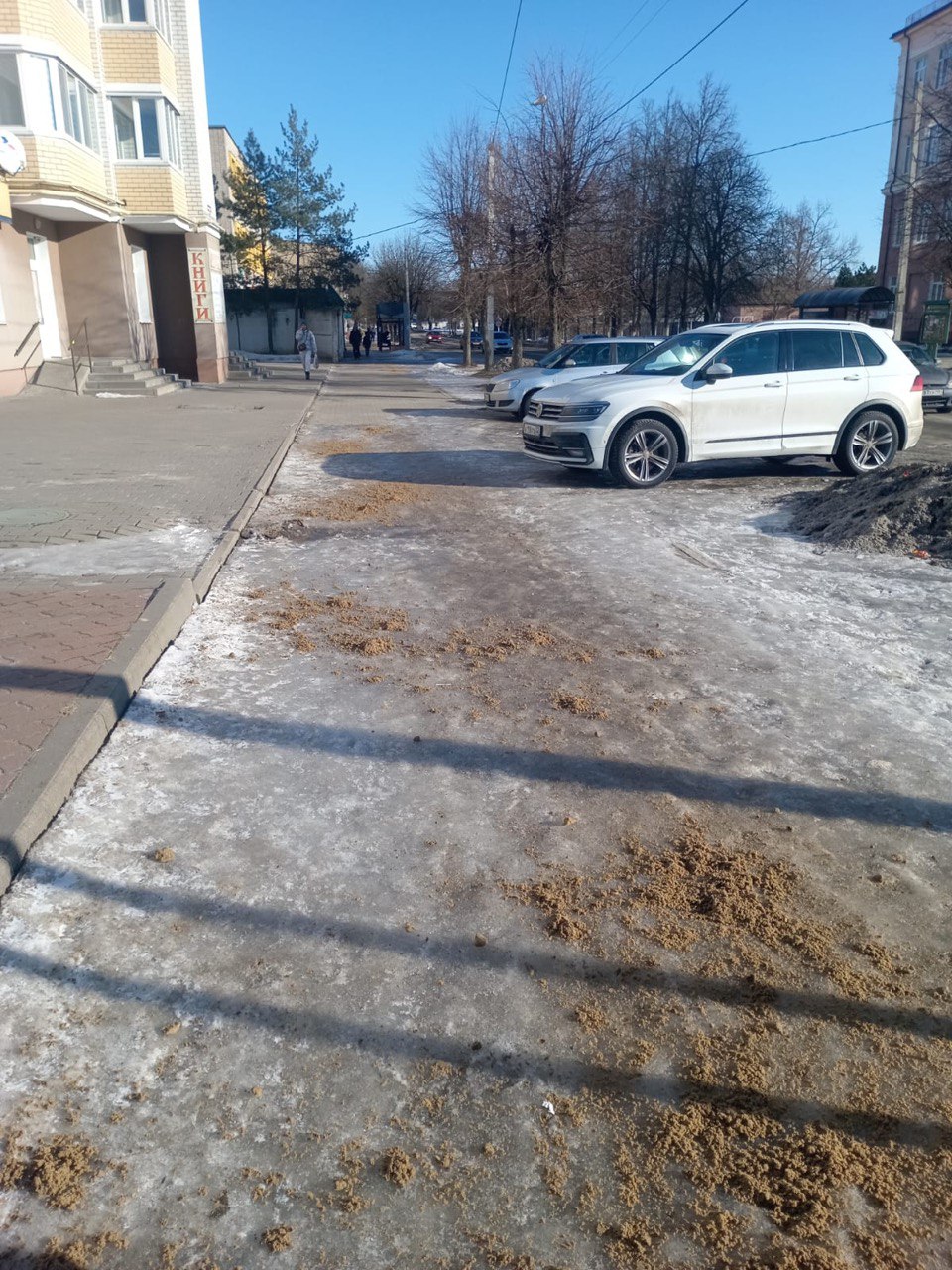 МУП «Торговые ряды» с утра 09.02.2024г. продолжают посыпку тротуаров города песко-соляной смесью.
