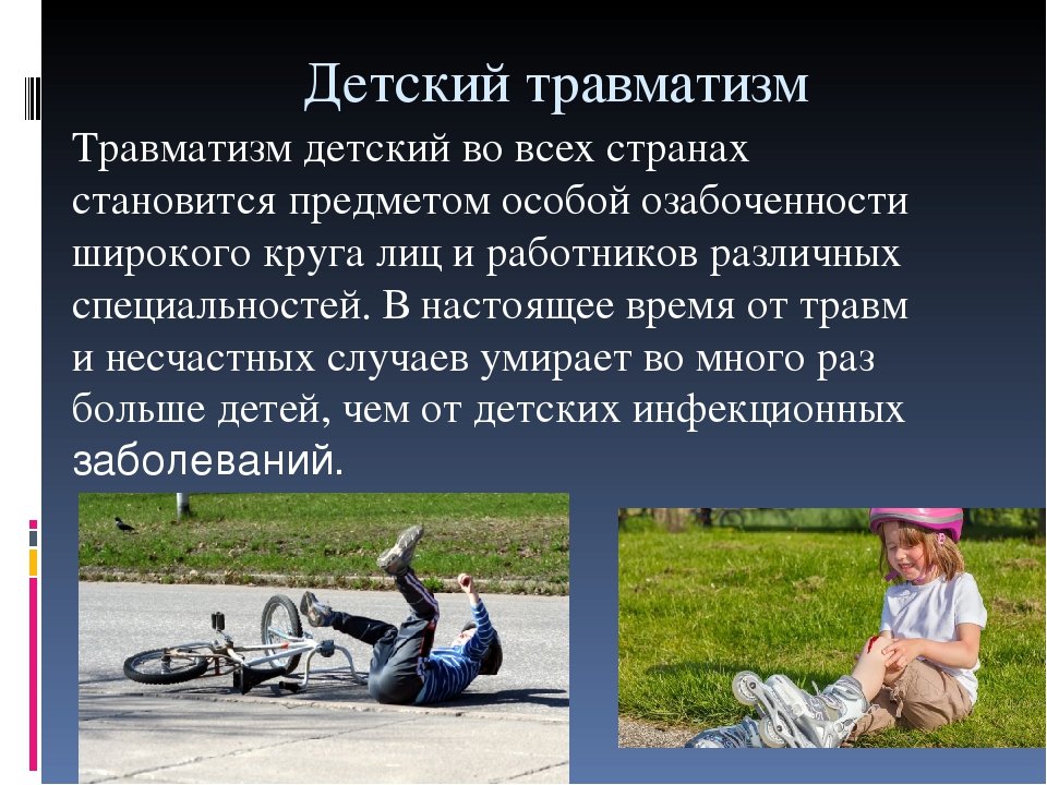 Несчастные случаи при езде на велосипеде являются распространенной причиной травматизма среди детей старшего возраста. Таких случаев можно избежать, если родственники и родители будут учить ребенка безопасному поведению при езде на велосипеде. Детям нужно надевать на голову шлемы и другие приспособления для защиты.