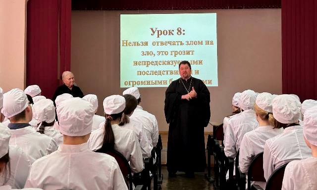 Продолжил мероприятий священник Новозыбковского Храма в честь Чуда Архистратига Михаила в Хонех иерей Серафим Похожай, который посоветовал молодым людям брать в руки Библию почаще, потому как в ней собрана вся мудрость, необходимая для нормальной жизни человеческой. Священник пожелал студентам, по собственной воле выбравшим белые одежды для будущего служения людям, честно и добросовестно пройти свое профессиональное поприще и подарил желающим маленькие иконы преподобного Паисия Величковского, имевшего от Бога особенный дар – направлять души людские ко спасению и враче¬вать их от страстей.