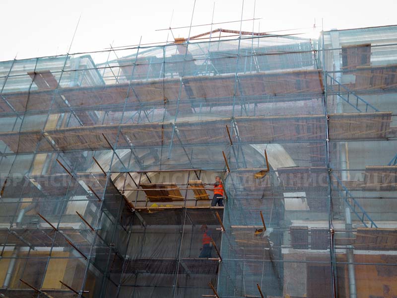 Дворец культуры железнодорожников в Фокинском районе Брянска «оделся» в строительные леса — снаружи и внутри здания начались ремонтные работы.
