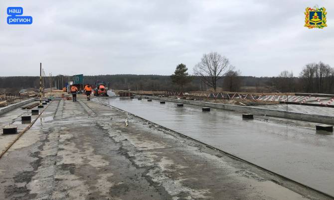 На проезжей части моста подрядчик проводит устройство выравнивающего слоя. На участке новой дороги, которая соединит Брянск, новый мост и Фокино устанавливают электроосвещение. Оно появится и на строящемся мосту.
